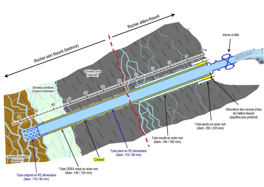 Après confirmation du concept hydrogéologique local, 2 forages drainants ont été mis en place avec succès, permettant une exploitation directe du réservoir souterrain profond ciblé pour la production d’eau minérale.